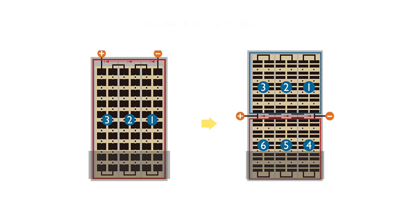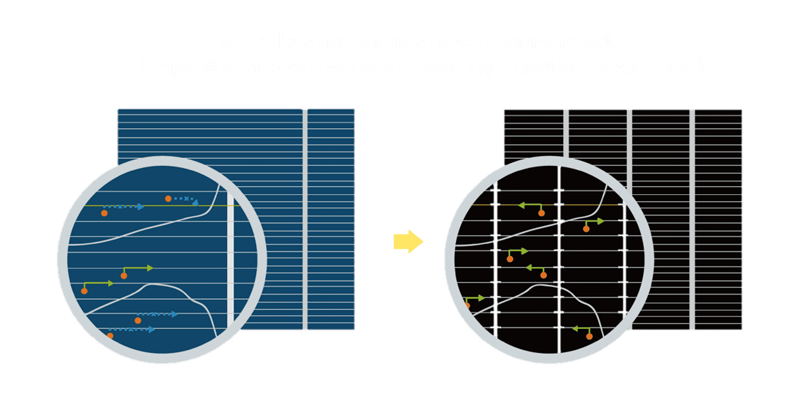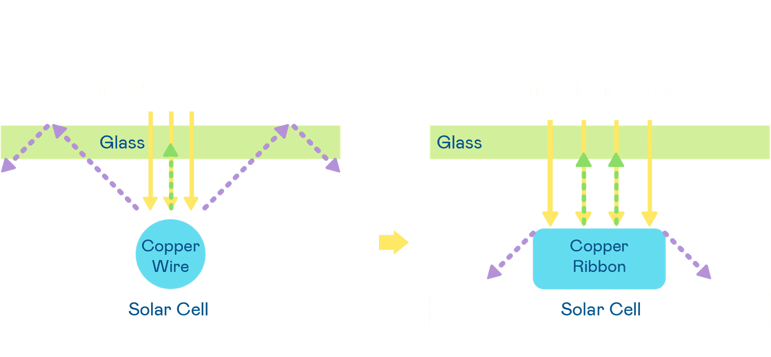 - 电池使用多条铜导线 (Copper wire) 于电池片上形成较短的电流路径,,,提高电流收集效率,,,,采用圆形设计的铜导线较传统扁平式的铜焊带 (Ribbon),,可增加入射至电池的光线量。。。